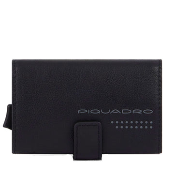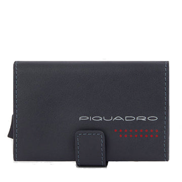 Piquadro- Kartenetui mit Schiebesystem aus Aluminium und grauem und schwarzem Leder.