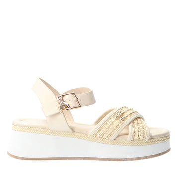 Sandali con fasce frontali incrociate in econappa intrecciata. Cinturino regolabile alla caviglia. Suola platform in gomma.