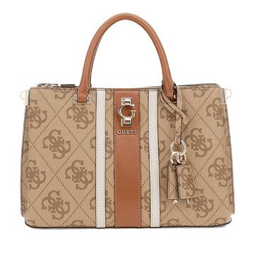 Borsa a mano in ecopelle logata. Tre scomparti organizzati e foderati, chiusi con zip e clip automatiche. Tasca posteriore chiusa con zip. Logo Guess sul davanti. Fascia frontale a contrasto. Charm logato removibile alla base del manico. Due manici lunghezza ca. 35 cm. Tracolla regolabile e removibile lunghezza ca. 110/130 cm.