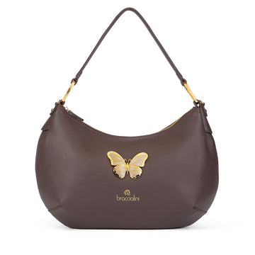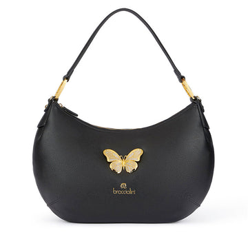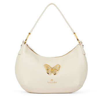 Borsa a spalla a forma di mezzaluna delle medio grandi dimensioni realizzata in morbida similpelle. Applicata sul quadrante frontale una deliziosa farfalla dorata con cristalli applicati. Pochette interna estraibile e tracolla removibile e regolabile.
