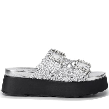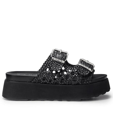 Attuali e alla moda, senza rinunciare alla propria anima rock, questo nuovo modello JANIS firmato Cult per l'estate 2025 diventerà un vero e proprio must-have. Due fasce in pelle nera con lavorazione intrecciata impreziosite da fibbie in metallo con logo Cult inciso e suola platform per questi sandali da abbinare a ogni outfit per un look decisamente glam rock.