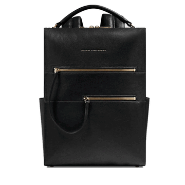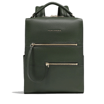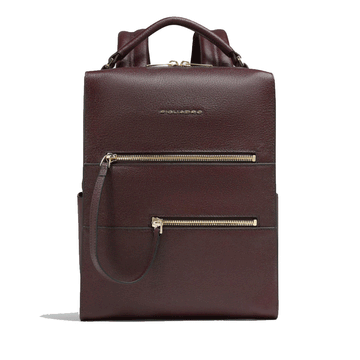 Zaino Piquadro in pelle porta computer 14" e porta iPad®. Protezione anti urto. Spallacci regolabili. Tasca porta AirPods®. Protezione fondo con piedini in metallo.